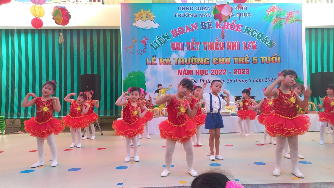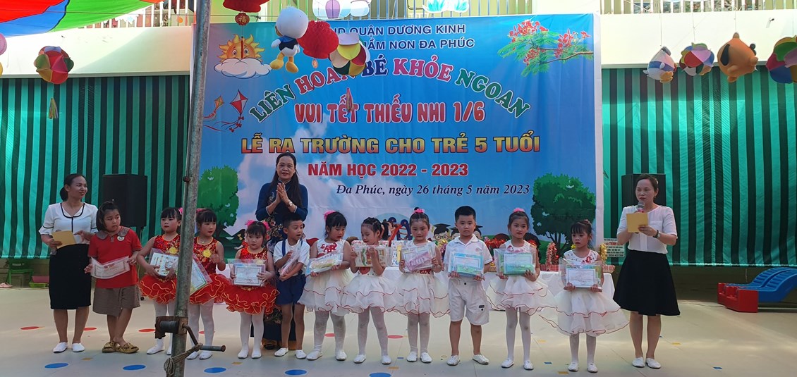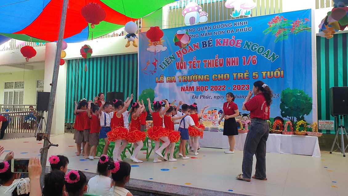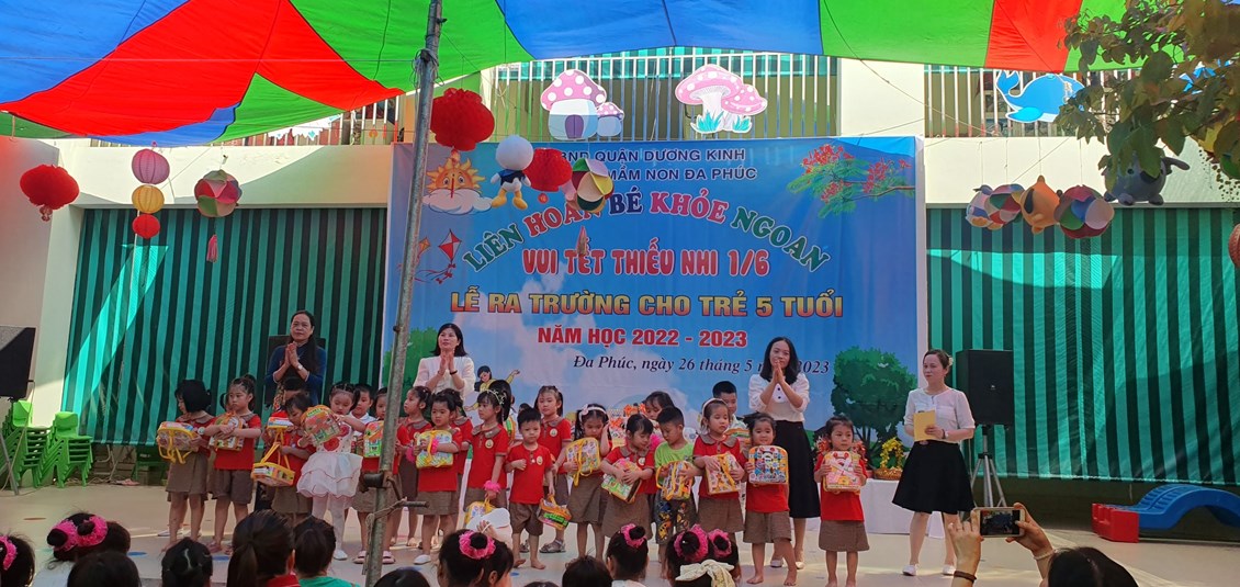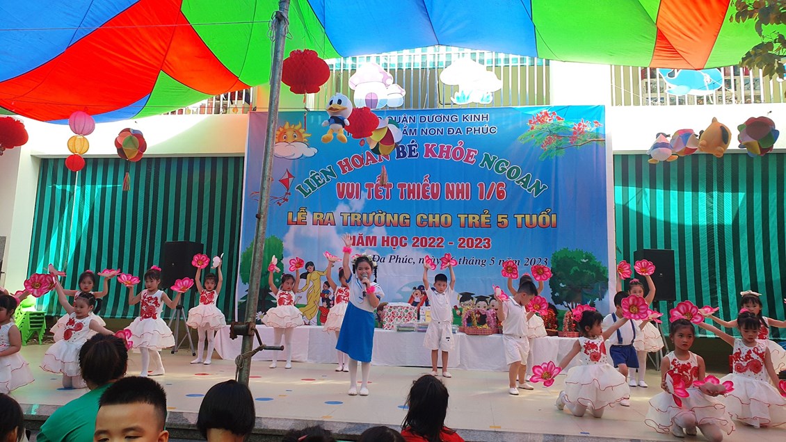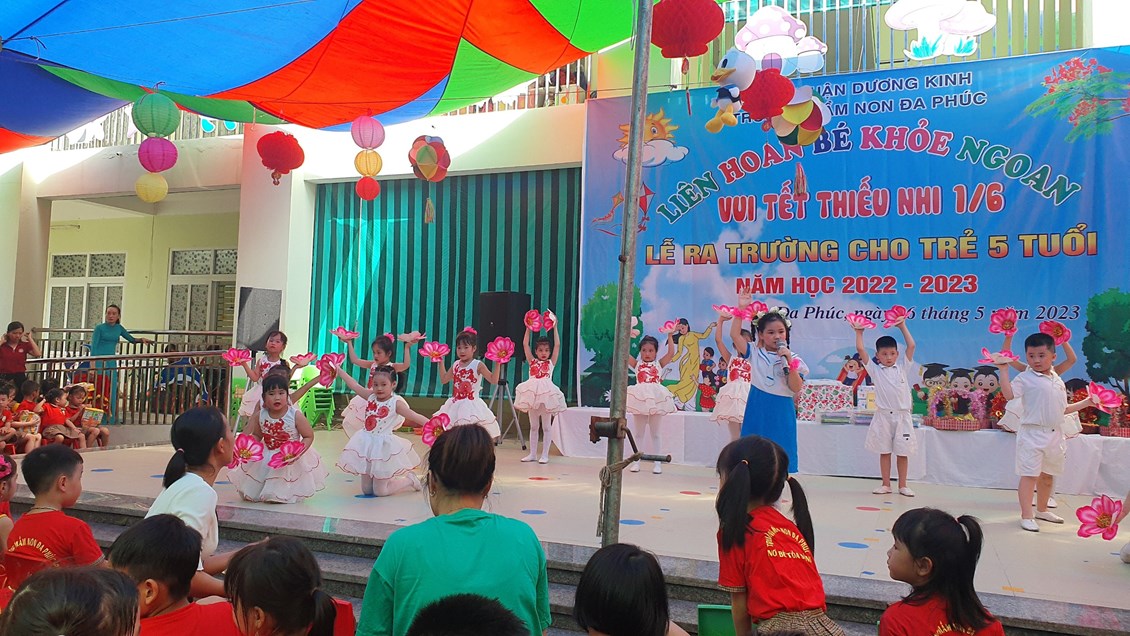 Về dự buổi Liên hoa có các đồng chí đại diện cho lãnh đạo PGD&ĐT quận Dương Kinh, các đồng chí lãnh đạo địa phương, các bậc phụ huynh và có đông đủ các cô giáo cùng 483 bạn học sinh trong toàn trường. Chương trình ''Liên hoan Bé khỏe ngoan - Vui Tết Thiếu nhi 1/6 - Lễ ra trường cho trẻ 5 tuổi. Năm học 2022 -2023'' được tổ chức theo các nội dung, hoạt động các lĩnh vực phát triển của trẻ trong chương trình giáo dục mầm non, bám sát nội dung và kết quả mong đợi về kiến thức, kỹ năng của trẻ theo từng độ tuổi. Đảm bảo tính khách quan, trung thực, công bằng được diễn ra nhẹ nhàng dưới nhiều hình thức, trẻ đã được giao lưu học hỏi các bạn góp phần mạnh dạn, tự tin tạo cho trẻ không khí phấn khởi, thân thiện.