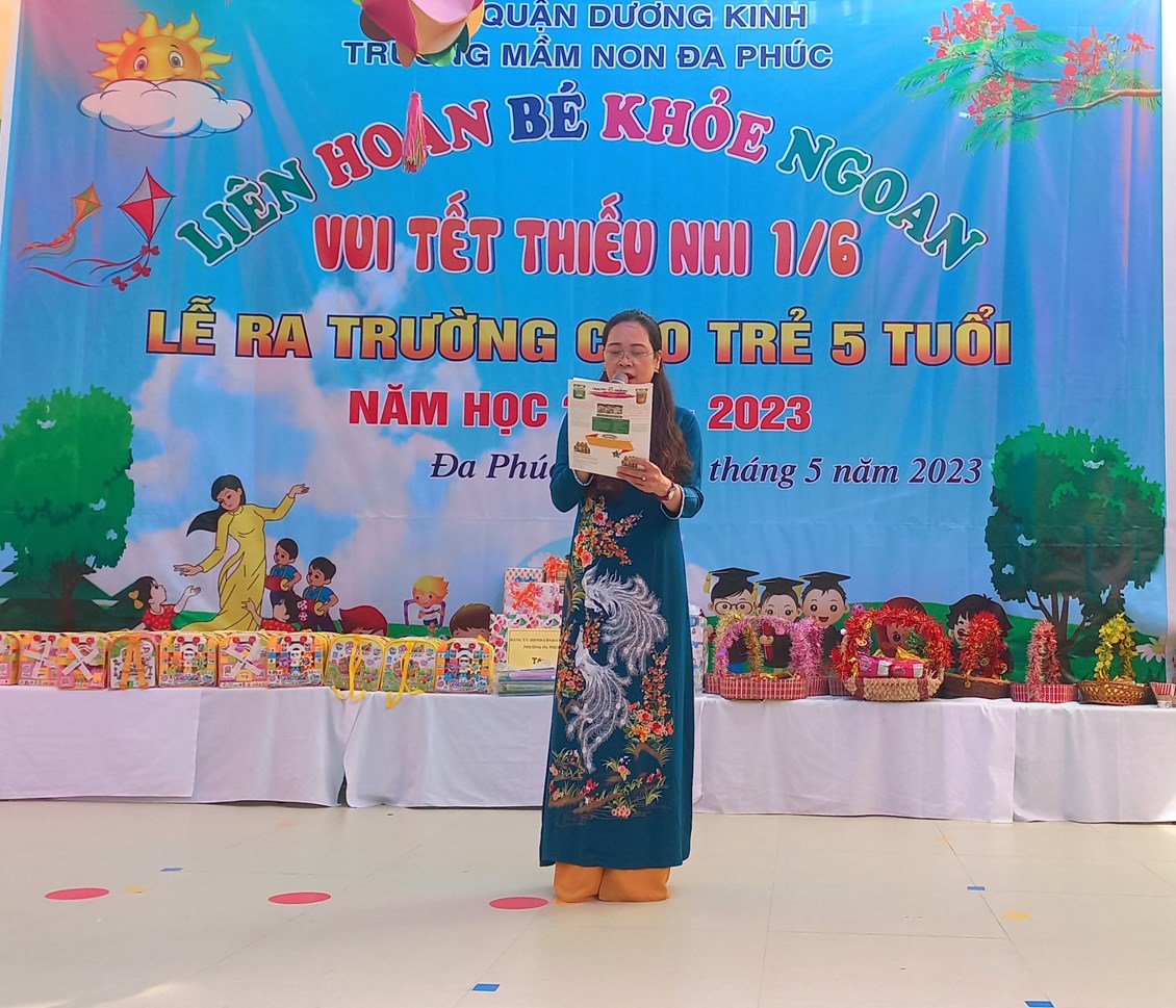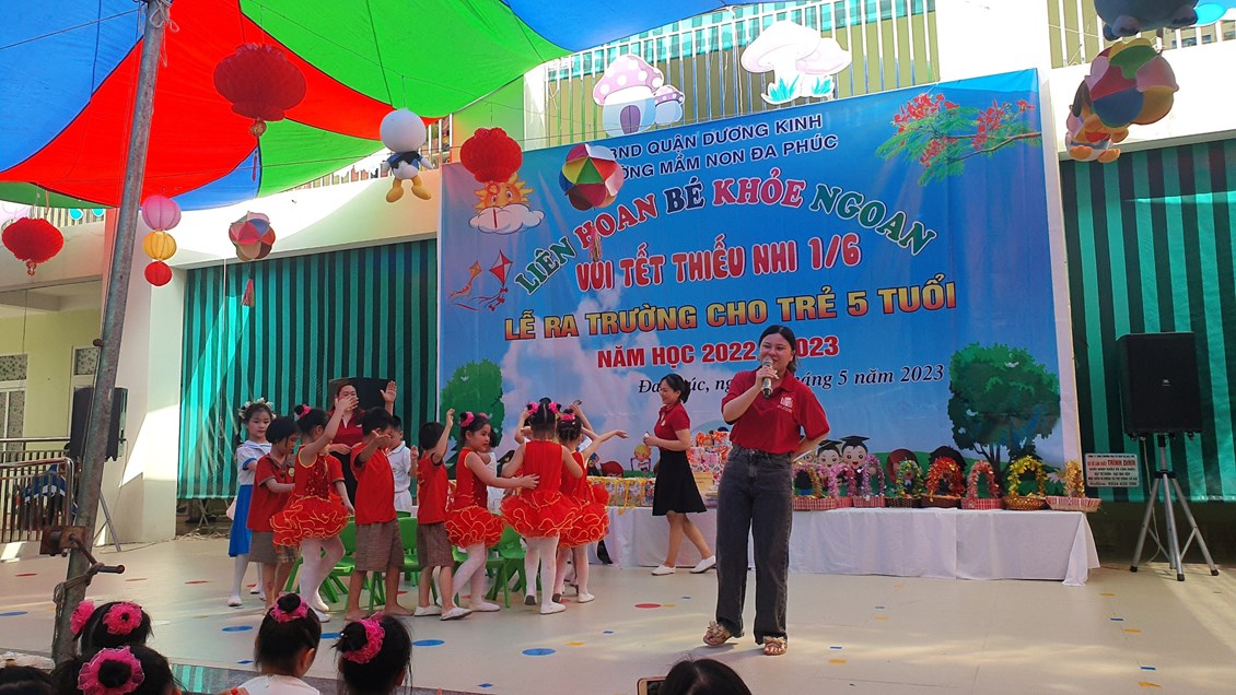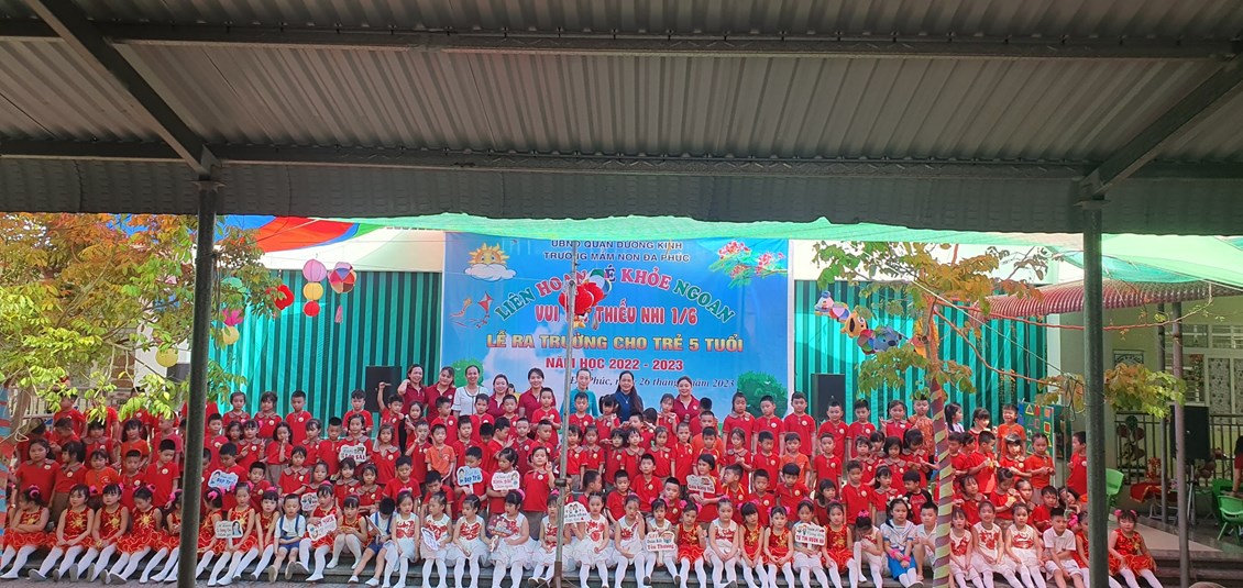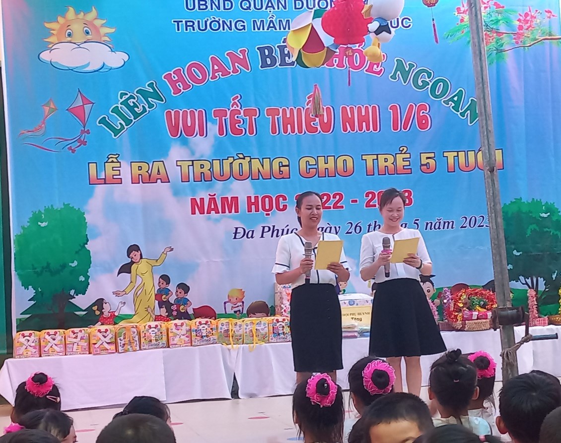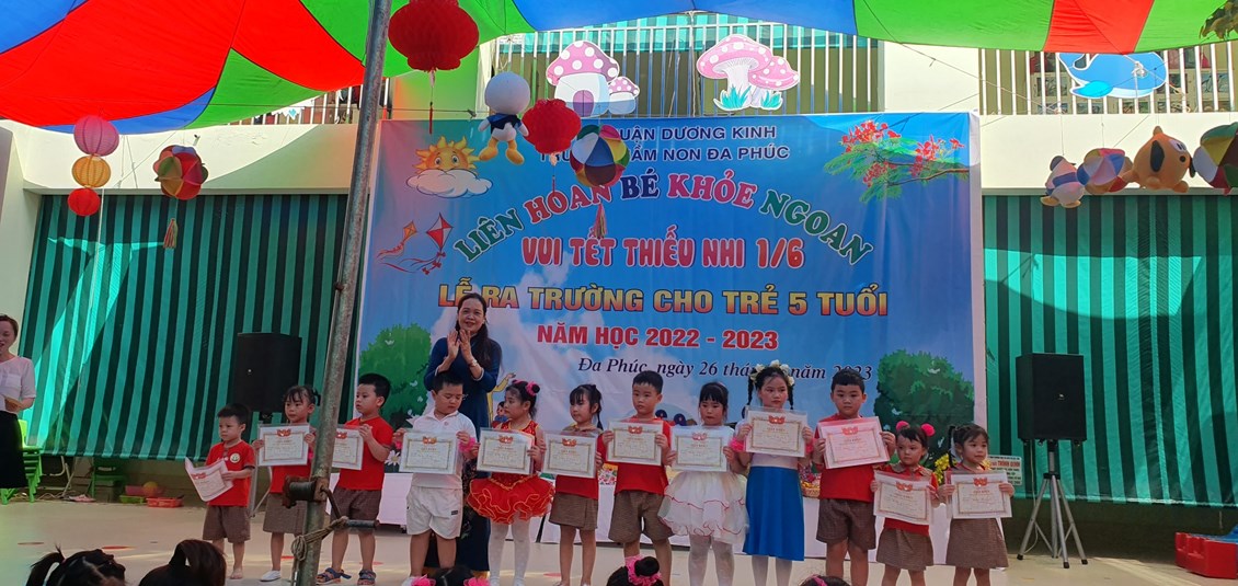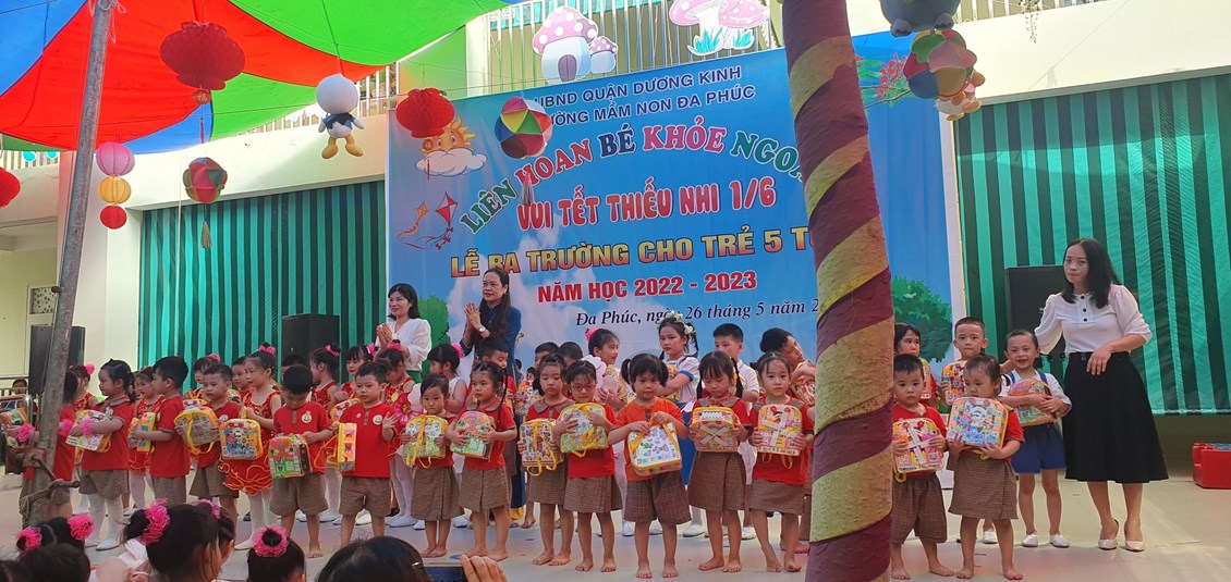 Về dự buổi Liên hoa có các đồng chí đại diện cho lãnh đạo PGD&ĐT quận Dương Kinh, các đồng chí lãnh đạo địa phương, các bậc phụ huynh và có đông đủ các cô giáo cùng 483 bạn học sinh trong toàn trường. Chương trình ''Liên hoan Bé khỏe ngoan - Vui Tết Thiếu nhi 1/6 - Lễ ra trường cho trẻ 5 tuổi. Năm học 2022 -2023'' được tổ chức theo các nội dung, hoạt động các lĩnh vực phát triển của trẻ trong chương trình giáo dục mầm non, bám sát nội dung và kết quả mong đợi về kiến thức, kỹ năng của trẻ theo từng độ tuổi. Đảm bảo tính khách quan, trung thực, công bằng được diễn ra nhẹ nhàng dưới nhiều hình thức, trẻ đã được giao lưu học hỏi các bạn góp phần mạnh dạn, tự tin tạo cho trẻ không khí phấn khởi, thân thiện.