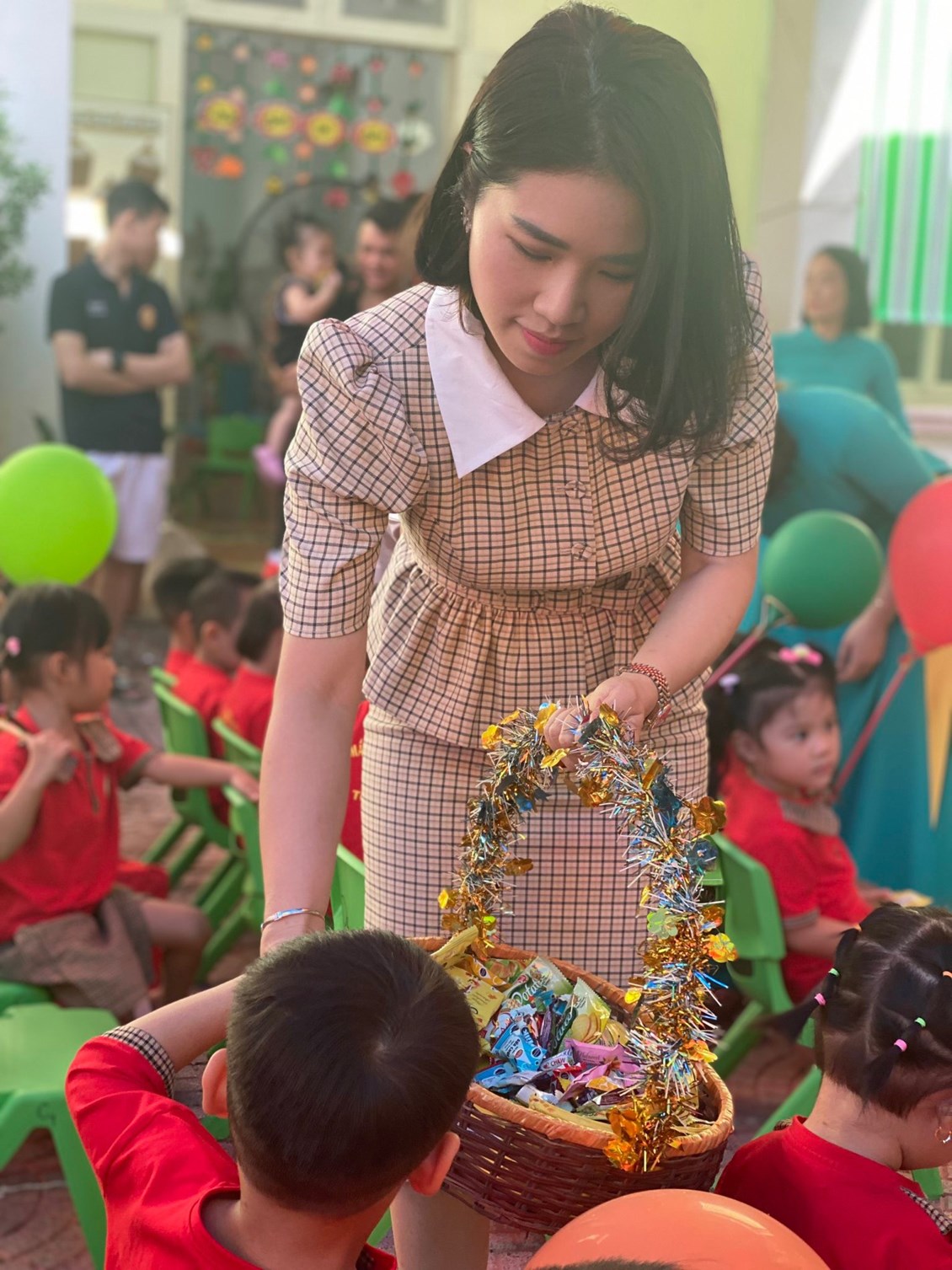 Cô Đồng Thị Tuyết Nhung- HT nhà trường lên trao quà cho các cháu học sinh có hoàn cảnh khó khăn