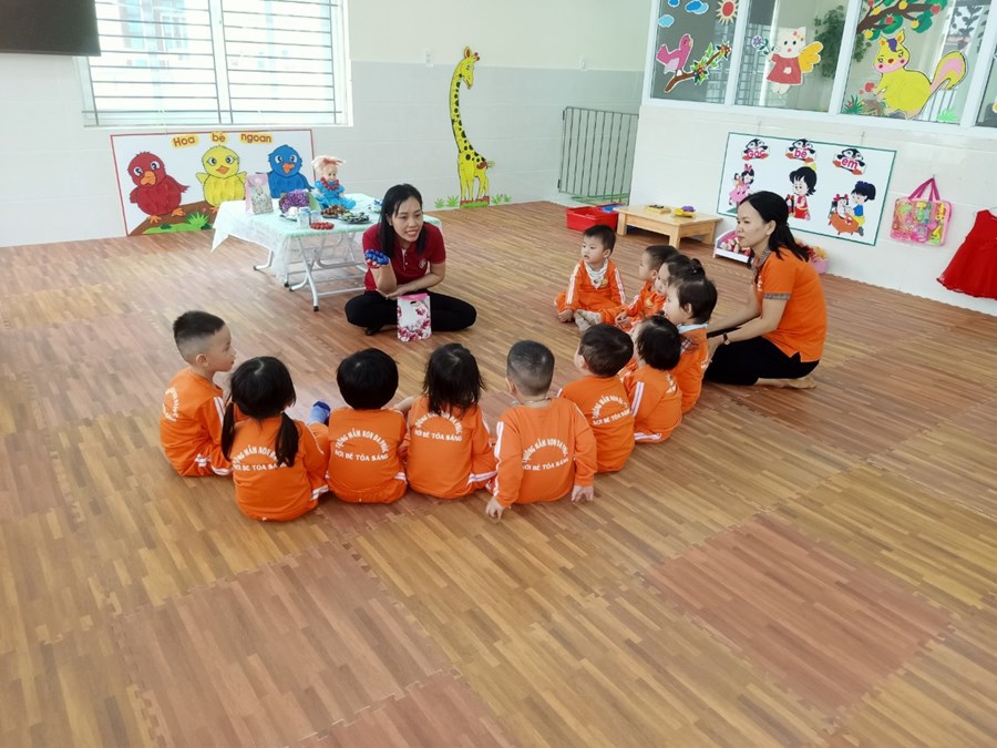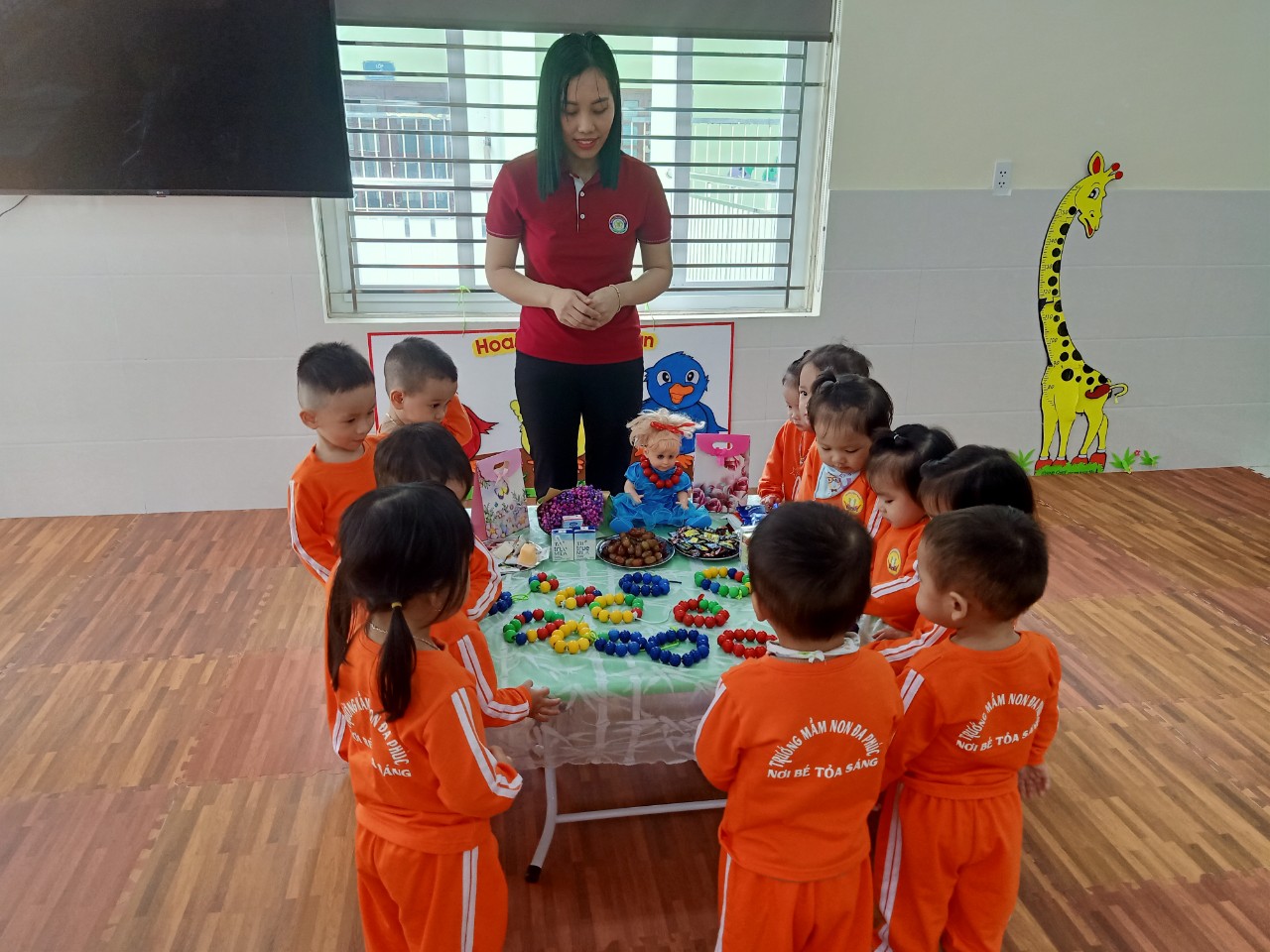 Cô giáo hướng dẫn trẻ xâu vòng.